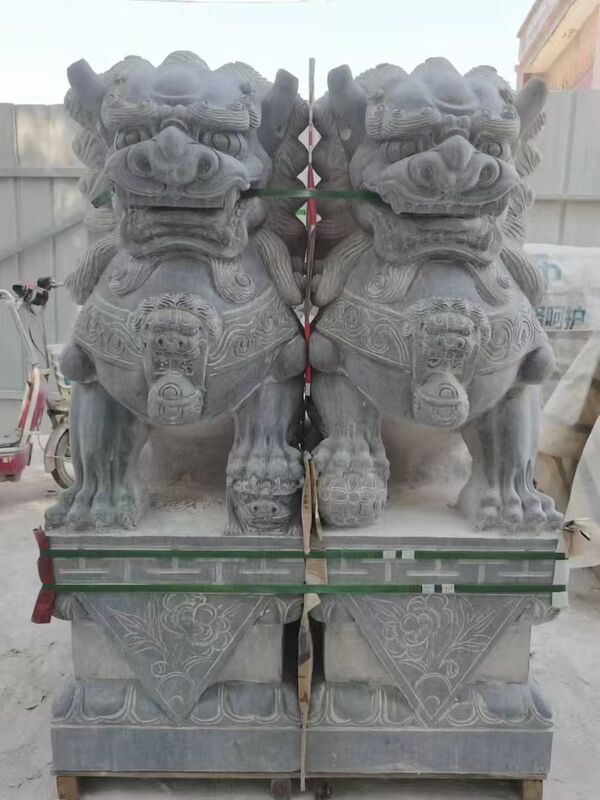 สิงโตหินที่เก่าแก่ที่สุดที่ยังหลงเหลืออยู่ในประเทศจีนเป็นของราชวงศ์ฮั่นตะวันออก ร่างกายของสิงโตหินในราชวงศ์ฮั่นมักจะถูกแกะสลักด้วยปีก สิงโตหินในยุคแรกๆ ส่วนใหญ่ใช้เป็นผู้พิทักษ์พระราชวังและสุสาน ประมาณราชวงศ์เหลียวและจิน สิงโตหินเริ่มถูกใช้อย่างแพร่หลายมากขึ้น รูปแบบของพวกมันเริ่มปรากฏบนหัวสะพานและเสาพนักกั้น สิงโตหินเหล่านี้มักจะมีรูปร่างที่แตกต่างกันและมีชีวิตชีวา ตัวอย่างเช่น สิงโตหินบนสะพาน Lugou ในปักกิ่งเป็นตัวแทนของยุคนี้ หลังจากราชวงศ์ซ่ง สิงโตหินมีแนวโน้มที่จะสวยงามยิ่งขึ้น พร้อมการตกแต่งและกระดิ่งที่คอ ในราชวงศ์หมิงและชิง รูปร่างของสิงโตหินก็ถูกสร้างขึ้นในที่สุดด้วยการก่อตัวของความหมายเชิงสัญลักษณ์ ตัวอย่างเช่น สิงโตหินหน้าประตูถูกวางในลักษณะที่เป็นระเบียบและสมมาตร และตำแหน่งก็เหมือนกับประเพณีที่ผู้ชายอยู่ทางซ้ายและผู้หญิงอยู่ทางขวา นั่นคือ เมื่อผู้คนเดินออกจากประตู สิงโตตัวผู้จะถูกวางไว้ทางด้านซ้ายของบุคคล ในขณะที่สิงโตตัวเมียจะอยู่ทางด้านขวา สิงโตตัวเมียทางด้านขวา เท้าหน้าซ้ายมักจะลูบคลำลูกสิงโต หรือลูกสิงโตนอนอยู่ระหว่างอุ้งเท้าหน้าสองข้าง สิงโตตัวผู้ทางด้านซ้ายมักจะเล่นกับดอกไฮเดรนเยียในอุ้งเท้าหน้าขวา หรือวางดอกไฮเดรนเยียไว้ระหว่างอุ้งเท้าหน้าสองข้าง ทั้งสองสอดคล้องกัน เป็นสัญลักษณ์ของ "การส่งต่อจากรุ่นสู่รุ่น"